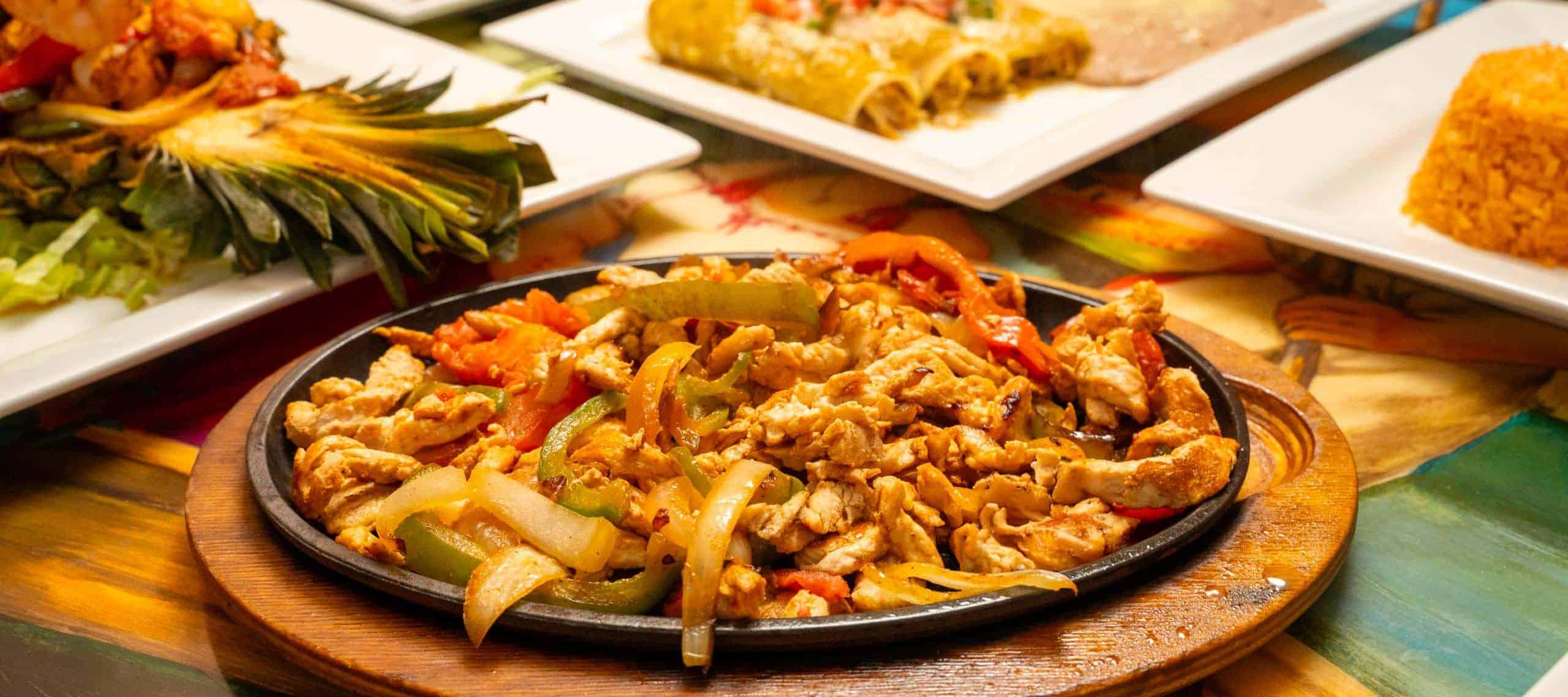 Tender strips of marinated chicken breast or sirloin steak strips with sautéed onions, tomatoes and bell peppers. Served with Mexican rice, refried black or pinto beans, lettuce, guacamole, sour cream, pico de gallo and flour or corn tortillas